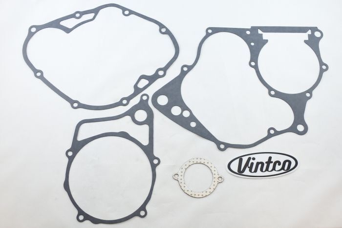 VintCo has all new engine gasket kits to help on your engine lower end rebuild. These gaskets are made with modern materials and manufacturing techniques to ensure an as good or better than OEM fitment and performance. The OEM part numbers are provided as a reference to ensure exact fitment. This gasket kit includes the Crankcase gasket, left Crankcase cover gasket, right Crankcase gasket and exhaust gasket to complete your build with ease. A top-end gasket kit is also available separately that has the critical top end gaskets to finish the job. These newly manufactured gaskets from VintCo will help you keep the ride going!