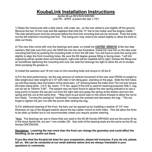 KoubaLink specialises in motorcycle lowering and performance linkages for off-road and dual-sport rear suspension systems. Compromise is not an option at KoubaLink. Listening to riders from all over the world explain where and how they use their off-road and dual-sport bikes. With their input, Koubalink manufacture products that add to your motorcycling experience and make it a little more enjoyable.