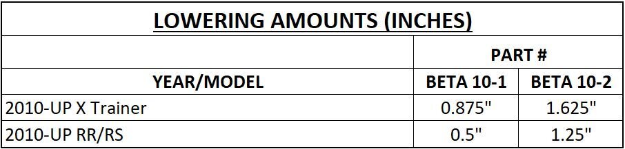 - Lowering amounts indicate REAR lowering, NOT overall bike height.