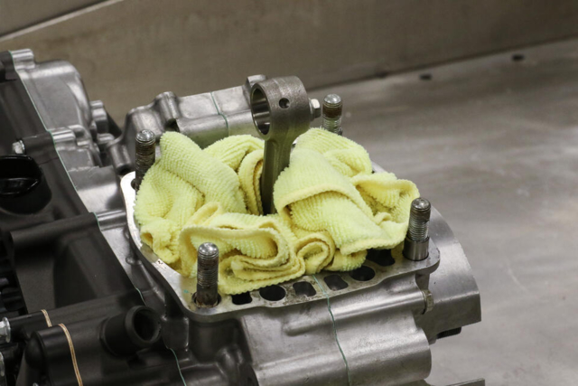 After you’ve removed the cylinder, make sure to wrap a clean, lint-free cloth on top of the crankcase so that dirt can’t enter. Any dirt or other particles will cause bottom end wear or even a seizure.