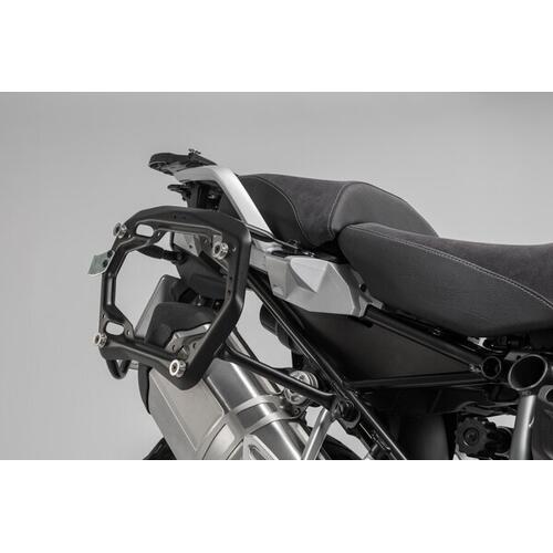 The Adventure set Luggage contains PRO side carriers to fit the Aprilia Tuareg with the matching ADVENTURE-RACK. The side carrier and rack are fastened to the bike-specific attachment points and offer sturdy support for the black TRAX ADV aluminium cases.