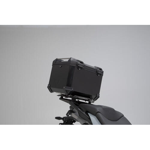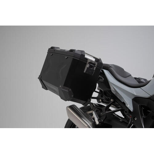 The Adventure set Luggage contains PRO side carriers to fit the Aprilia Tuareg with the matching ADVENTURE-RACK. The side carrier and rack are fastened to the bike-specific attachment points and offer sturdy support for the black TRAX ADV aluminium cases.