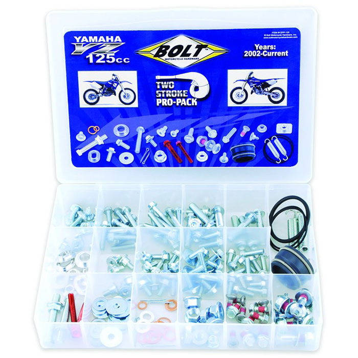 This complete kit contains all necessary replacement exhaust components (O-rings, pipe to muffler coupler, springs), complete hardware and bushing assortment specific to the bike, sprocket bolts, rotor bolts, etc. Designed solely around the YZ125. This will be a very specific kit to the beloved 125. Yamaha hardware has always been a little different with oval bushings and over sized flanges on some bolts. We have you covered with the YZ 125 Pro-Pack. This kit contains OEM style hardware in factory style & finish.