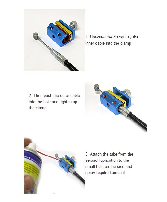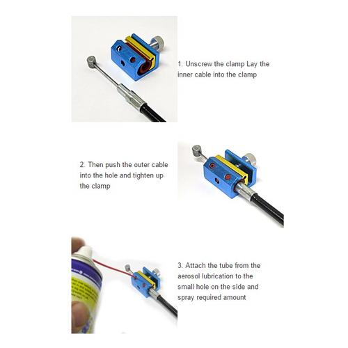 The tool clamps to the cable and the lube is forced in and the cable is lubed quick and easy. See photos below of one in use,