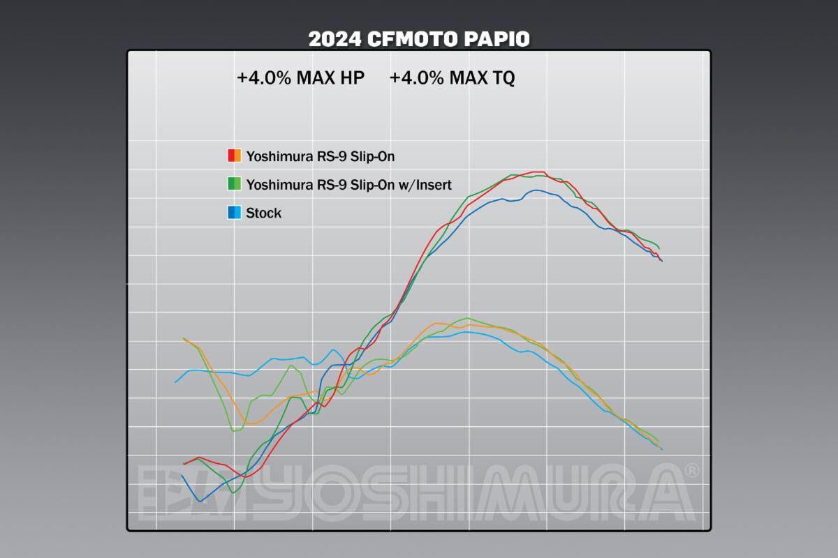 Our RS-9 Street Series Slip-on was a perfect match for the Papio SS styling cues and fits perfectly under the tail section of the little machine. Performance was a hit as well, the Papio SS responded very well adding 4.0 % max hp and 4.0 % max torque the the 126cc engine. On the street you can really feel the difference and the sound note from the RS-9 is nothing short of legendary. Ditching the stock muffler will save you almost two pounds as well. Now the new Papio SS is even more fun!