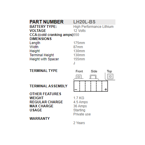 A normal lead acid motorcycle battery is designed to last for 200 300 cycles, whereas SSB PowerSport Lithium Batteries are designed to last for over 2,000 cycles (more than 10 Years design life). In addition, they can sit unused for over a year without losing charge and can also be charged extremely quickly without damaging the battery.