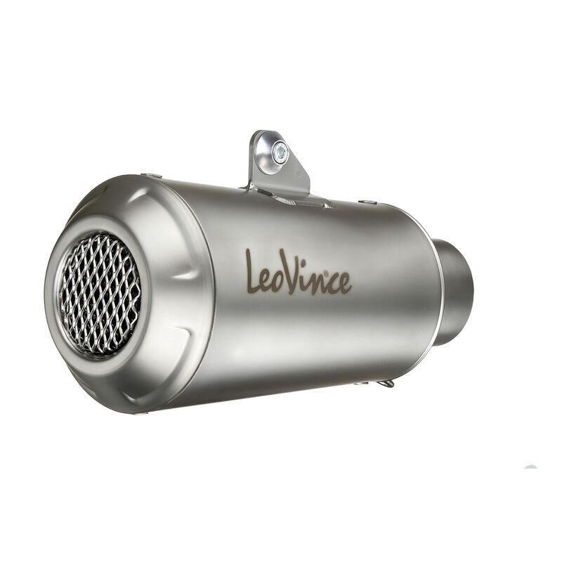 Developed with Moto2 / Moto3 teams!AISI 304 Stainless Steel sleeve and componentsShot blasted Stainless end cap with Stainless meshSuper Compact design with conical shapeShot blasted “Titanium look” finishLaser cut bracketLaser etched LeoVince logoTIG weldsHigh quality thermal resistant Fiberglass packing