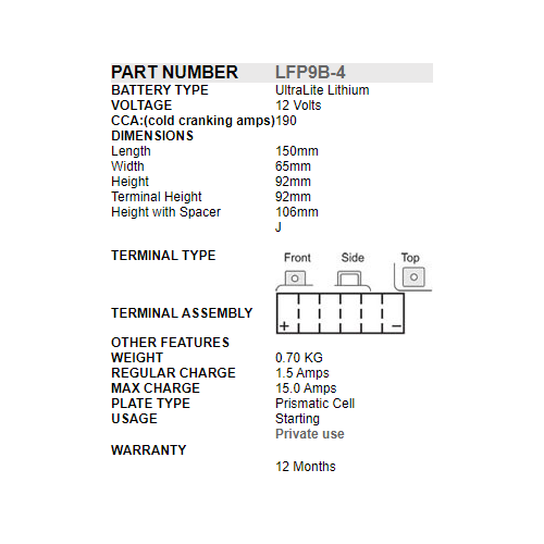 Unlike many other lithium batteries, SSB PowerSport Lithium Batteries are made using prismatic cells making them not only safe to use, but also boasts higher CCA (cold cranking amps), better cyclic properties and have a longer life. We are aware of only one other brand of lithium starting battery that uses prismatic cells. Other brands generally use cylindrical cells and while they may be a little cheaper due to lower manufacturing costs, they are inferior and are not designed for starting vehicles.​