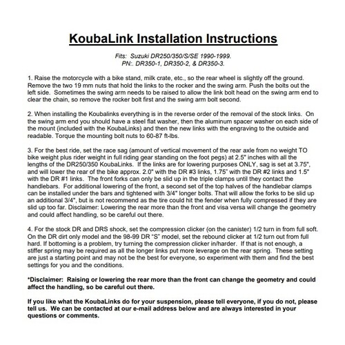 KoubaLink specialises in motorcycle lowering and performance linkages for off-road and dual-sport rear suspension systems. Compromise is not an option at KoubaLink. Listening to riders from all over the world explain where and how they use their off-road and dual-sport bikes. With their input, Koubalink manufacture products that add to your motorcycling experience and make it a little more enjoyable.