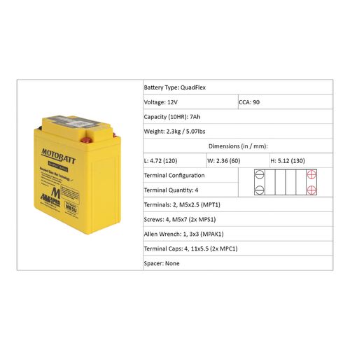 Motobatt batteries are manufactured from Absorbed Glass Mat (AGM), this design has revolutionised the motorcycle, ATV, lawnmower and small engine industry. QuadFlex provides a unique four-terminal design with two positives, two negatives along with height spacers that permit an almost universal fit. All Motobatt AGM Batteries are maintenance free, non-hazardous, non-spill, charged and ready to install directly out of the box.
