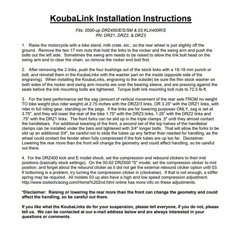 KoubaLink specialises in motorcycle lowering and performance linkages for off-road and dual-sport rear suspension systems. Compromise is not an option at KoubaLink. Listening to riders from all over the world explain where and how they use their off-road and dual-sport bikes. With their input, Koubalink manufacture products that add to your motorcycling experience and make it a little more enjoyable.