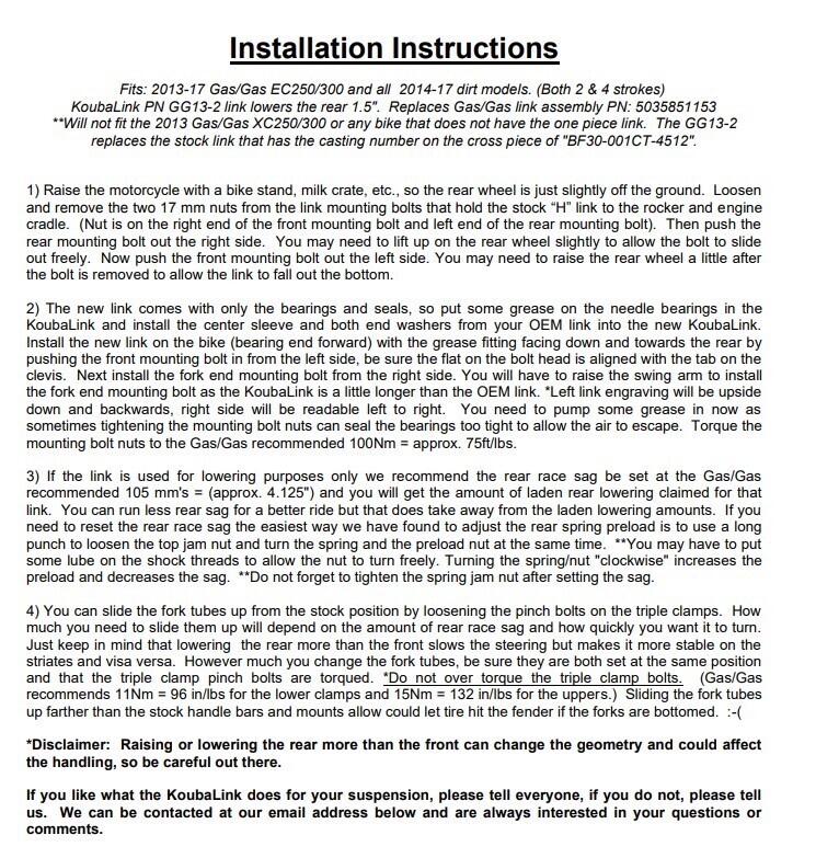 KoubaLink specialises in motorcycle lowering and performance linkages for off-road and dual-sport rear suspension systems. Compromise is not an option at KoubaLink. Listening to riders from all over the world explain where and how they use their off-road and dual-sport bikes. With their input, Koubalink manufacture products that add to your motorcycling experience and make it a little more enjoyable.