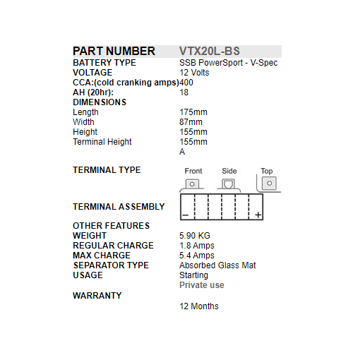 These batteries feature high-impact polypropylene plastic casing for added strength and polyethylene envelope separators for superior performance. The SSB Powersport Conventional Range is manufactured to high-quality standards and exceeds the minimum original equipment (OEM) requirement for most motorcycles sold in Australia.
