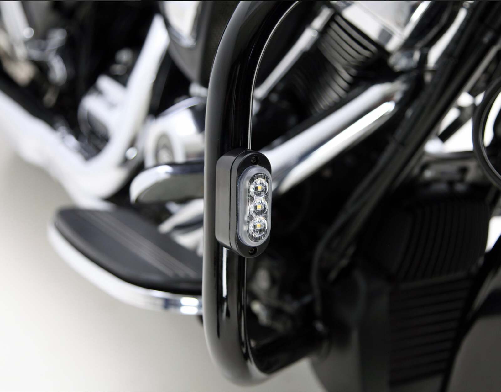 These low-profile mounting adapters are made from durable gloss back ABS and allow you to seamlessly mount T3 Signal Pods to 1.25" engine guards or crashbars commonly found on cruiser motorcycles. The mounting adapter is fixed to the bar with 3M VHB foam double-stick tape creating the illusions that the T3 Signal Pods were built into the bar right from the factory. A channel allows the wire to exit the housing, but you can also run the wire inside the bar for a super custom look. These adapters fit all Harley-Davidson engine guards and all aftermarket engine guards measuring 1.25 inches in diameter. Click here to learn more about our groundbreaking T3 Modular Switchback Signal Pods.