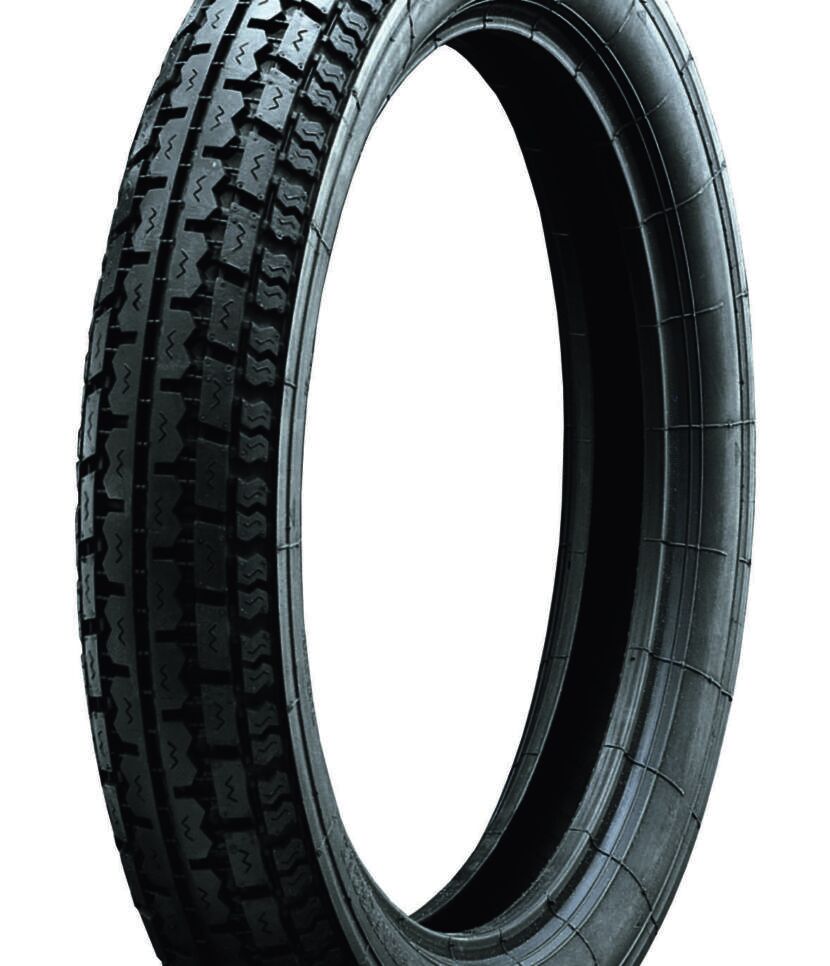 Vintage motorcycle street tire featuring a classic block tread pattern that originally came on some Eastern European bikes
