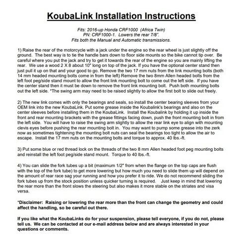 KoubaLink specialises in motorcycle lowering and performance linkages for off-road and dual-sport rear suspension systems. Compromise is not an option at KoubaLink. Listening to riders from all over the world explain where and how they use their off-road and dual-sport bikes. With their input, Koubalink manufacture products that add to your motorcycling experience and make it a little more enjoyable.