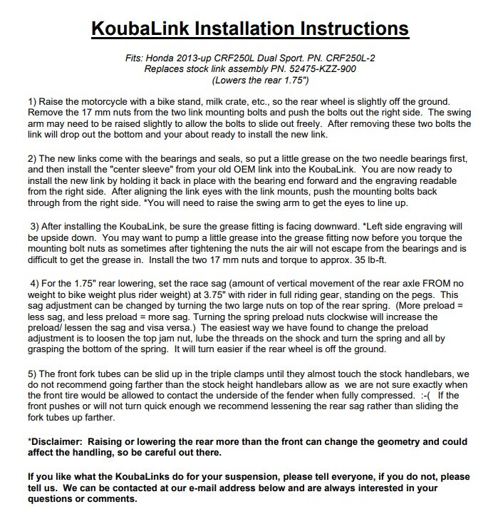 - Fits 2017-UP CRF 250L Rally, lowers the rear 1.50 inches.