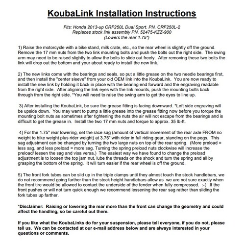 KoubaLink specialises in motorcycle lowering and performance linkages for off-road and dual-sport rear suspension systems. Compromise is not an option at KoubaLink. Listening to riders from all over the world explain where and how they use their off-road and dual-sport bikes. With their input, Koubalink manufacture products that add to your motorcycling experience and make it a little more enjoyable.