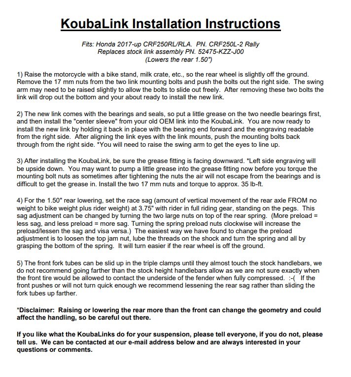 - Fits 2017-UP CRF 250L Rally, lowers the rear 1.50 inches.