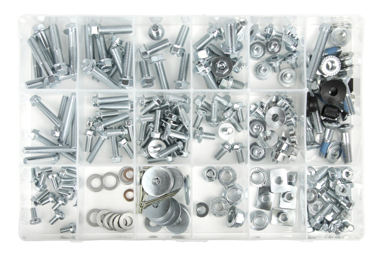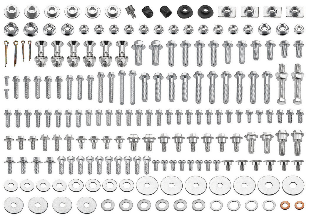 It is suitable for fastening most parts of your bike and includes an assortment of hex flange bolts, fender washers, OEM style bolts, nuts, and more.