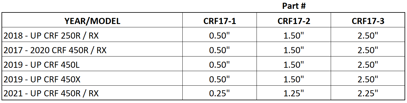 - Lowering amounts indicate REAR lowering, NOT overall bike height.