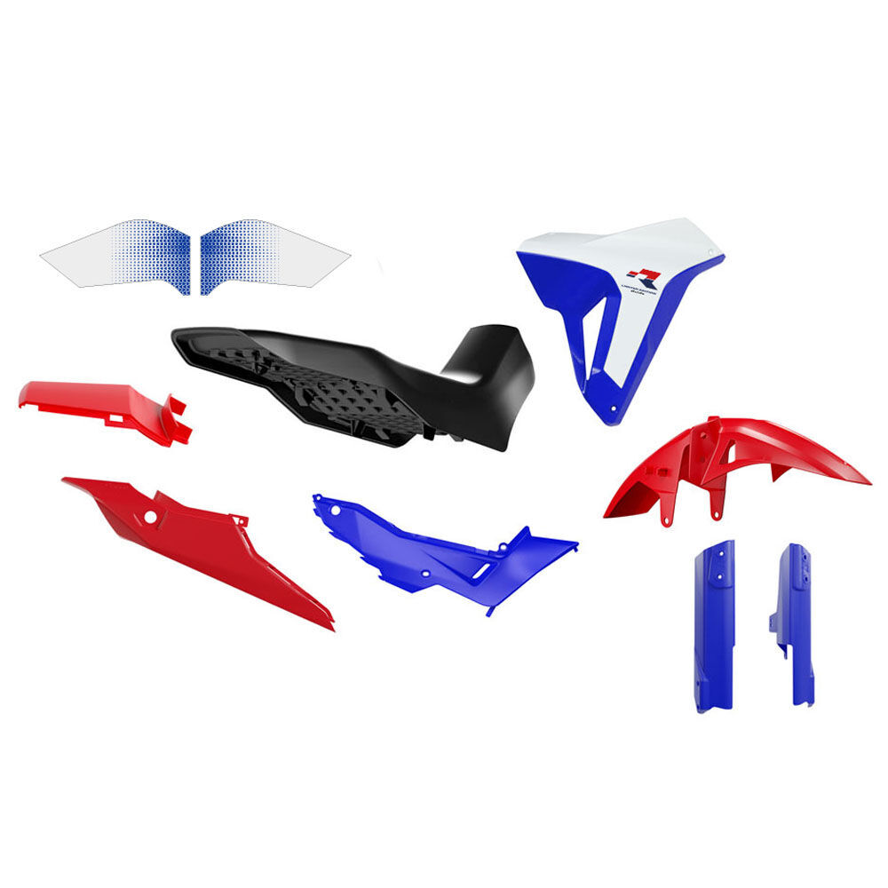 Includes Front fender/Rear fender/Radiator scoops/Central side panels/Rear side panels/Fork protectors/Complete seat