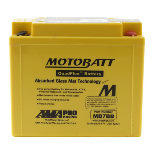 Motobatt batteries are manufactured from Absorbed Glass Mat (AGM) this design has revolutionised the motorcycle ATV lawnmower and small engine industry. QuadFlex provides a unique four-terminal design with two positives two negatives along with height spacers that permit an almost universal fit. All Motobatt AGM Batteries are maintenance-free non-hazardous non-spill charged and ready to install directly out of the box.