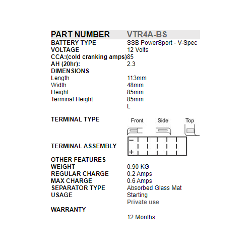 MPN:4-VTR4A-BS;BRAND:SSB;Product Type:Battery;Cold Cranking Amperage:85;Item Length:113;Item Width:48;Item Height:85;Item Weight:1.02;Type:AGM Battery;Voltage:12 V;
