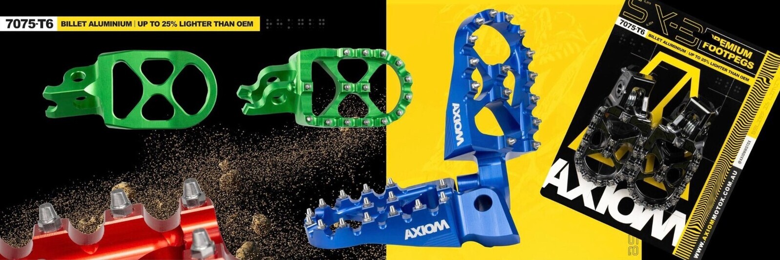 Axiom SX-3 Premium Footpegs set the benchmark when it comes to aluminium footpegs. Precision engineered from 7075-T6 aluminium using the latest manufacturing processes and development input from factory riders, has created an extremely lightweight footpeg that provides the ultimate grip with unrivalled strength.