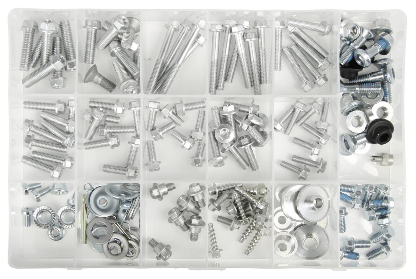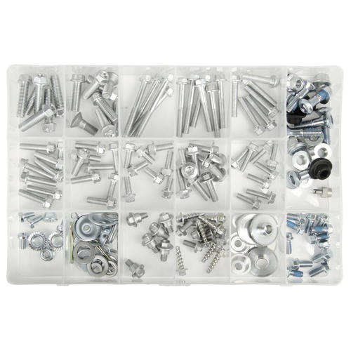 It is suitable for fastening most parts of your bike and includes an assortment of hex flange bolts, fender washers, OEM style bolts, nuts, and more.