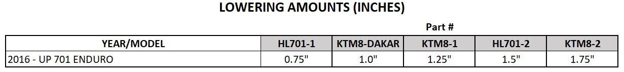 - Lowering amounts indicate REAR lowering, NOT overall bike height.