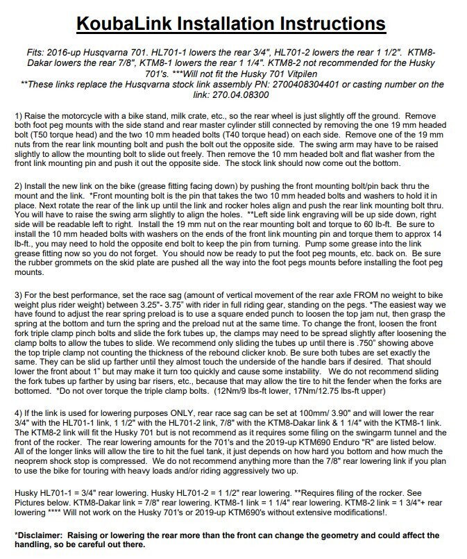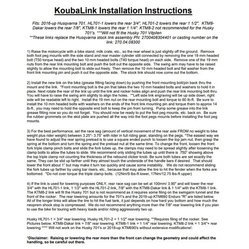KoubaLink specialises in motorcycle lowering and performance linkages for off-road and dual-sport rear suspension systems. Compromise is not an option at KoubaLink. Listening to riders from all over the world explain where and how they use their off-road and dual-sport bikes. With their input, Koubalink manufacture products that add to your motorcycling experience and make it a little more enjoyable.