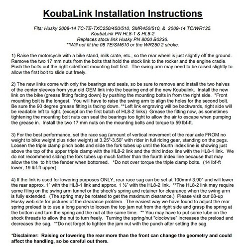 KoubaLink specialises in motorcycle lowering and performance linkages for off-road and dual-sport rear suspension systems. Compromise is not an option at KoubaLink. Listening to riders from all over the world explain where and how they use their off-road and dual-sport bikes. With their input, Koubalink manufacture products that add to your motorcycling experience and make it a little more enjoyable.