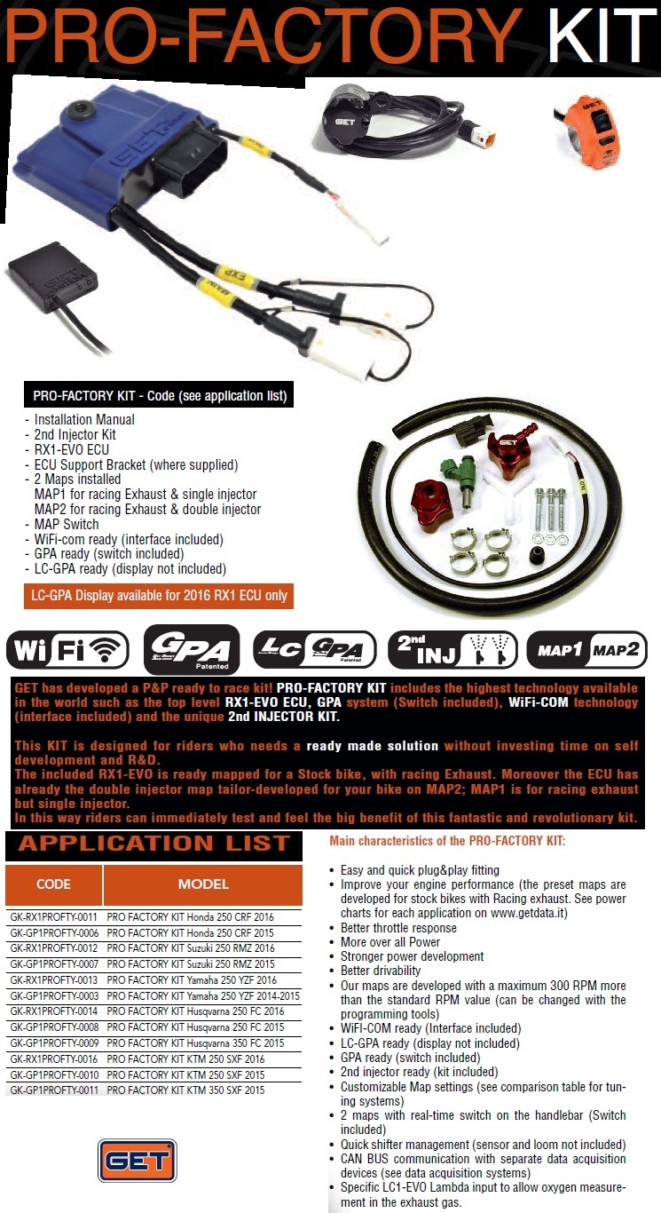 GET has developed a Plug & Play ready to race kit! The Pro Factory Kit includes the highest technology available in the world such as the top level RX1-EVO ECU, GPA system (Switch included), WiFi-Com technology (interface included) and the unique 2nd Injector Kit. The RX1 Evo ECU features two different map configurations: Map 1 for a stock bike with racing exhaust, while Map 2 is tailor-developed for the 2nd Injector. The EVO ECU map settings can always be modified using GET Software and Programming tools.