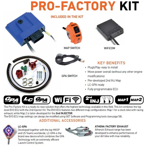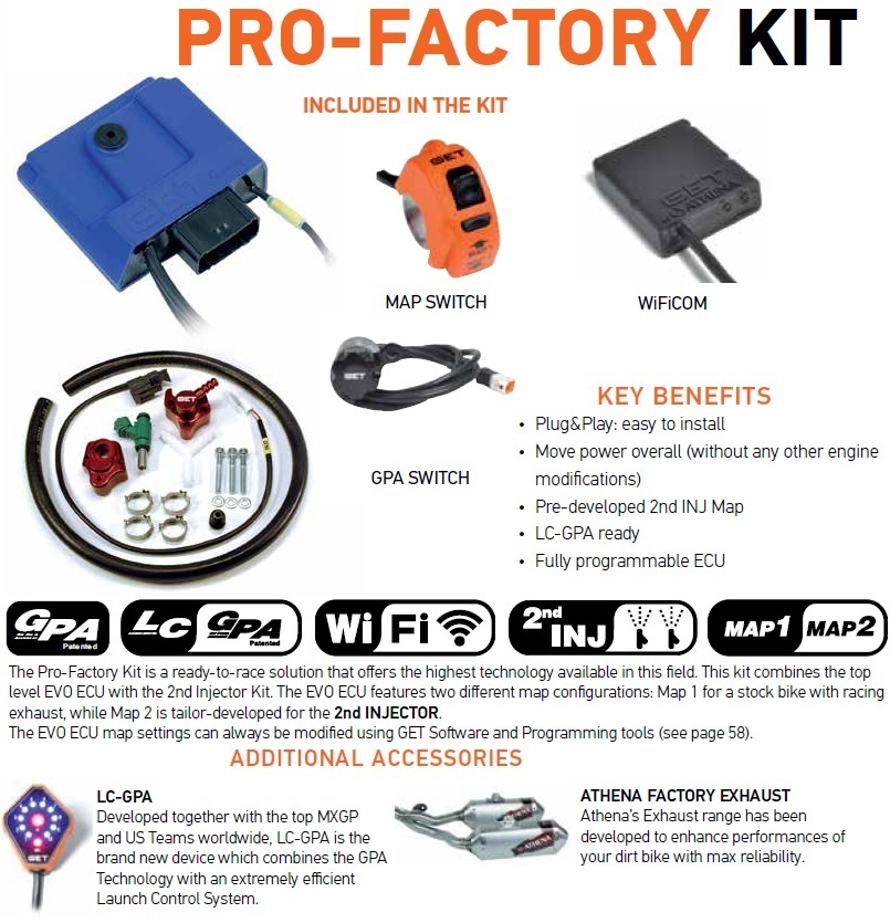 The Pro-Factory Kit is a ready-to-race solution that offers the highest technology available in this field. This kit combines the top level EVO ECU with the 2nd Injector Kit. The EVO ECU features two different map configurations: Map 1 for a stock bike with racing exhaust, while Map 2 is tailor-developed for the 2nd Injector. The EVO ECU map settings can always be modified using GET Software and Programming tools.Thanks to this new system, the driver can focus solely on finding the best balance and best tracks with his feet on the pegs. It enables you to enter curves at a higher speed on any surface. Better control on slippery surfaces and easier driving are probably the most notable and important advantages of a GPA.