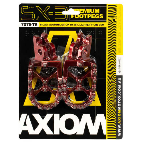 Axiom SX-3 Premium Footpegs set the benchmark when it comes to aluminium footpegs. Precision engineered from 7075-T6 aluminium using the latest manufacturing processes and development input from factory riders, has created an extremely lightweight footpeg that provides the ultimate grip with unrivalled strength.