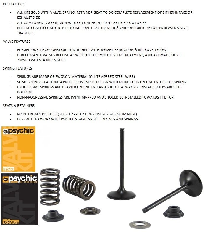Quality is very important to us, but it has it's price. The steel valves offer increased durability and easily extends 3 times the lifespan of the OEM Titanium valves. Due to the extra weight of the steel a heavier valve spring must be used! Psychic has developed the Steel Intake and Exhaust Valve & Spring Kits, containing a set of steel intake or exhaust valves plus a set of specially designed stronger valve springs. The Psychic kit juts replaces the OEM valves & valve springs and can be installed using the OEM retainers, bases and valve seats.