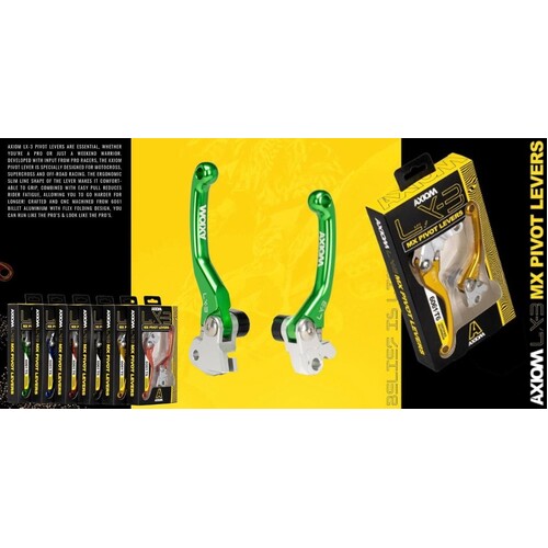 Axiom LX-3 Pivot Levers are essential, whether youÂ’re a Pro or just a weekend warrior. Developed with input from pro racers, the Axiom pivot lever is specially designed for motocross, supercross and off-road racing. The Ergonomic slim line shape of the lever makes it comfortable to grip, combined with easy pull reduces rider fatigue, allowing you to go harder for Longer! Crafted and CNC machined from 6061 Billet aluminum with flex folding design, you can run like the ProÂ’s and look like the ProÂ’s.