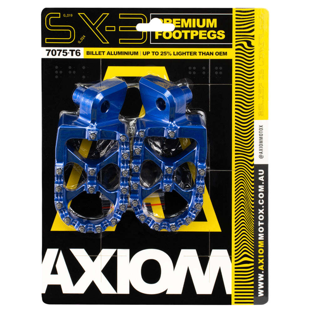 Axiom SX-3 Premium Footpegs set the benchmark when it comes to aluminium footpegs. Precision engineered from 7075-T6 aluminium using the latest manufacturing processes and development input from factory riders, has created an extremely lightweight footpeg that provides the ultimate grip with unrivalled strength.