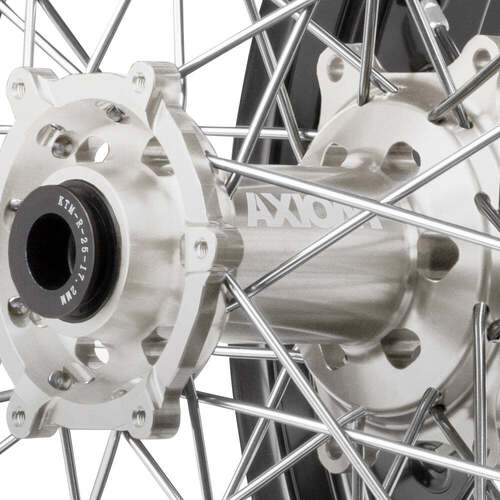 Axiom hubs are machined from solid billet 6082-T6 aircraft grade aluminium. They are fitted CS race wheel bearings, spacers, and seals. Axiom wheels are built utilizing extra strong, high tensile, polished stainless steel spokes laid out in a cross three lacing pattern for additional strength. Pre-fitted with CNC machined heavy duty aluminium nipples.
