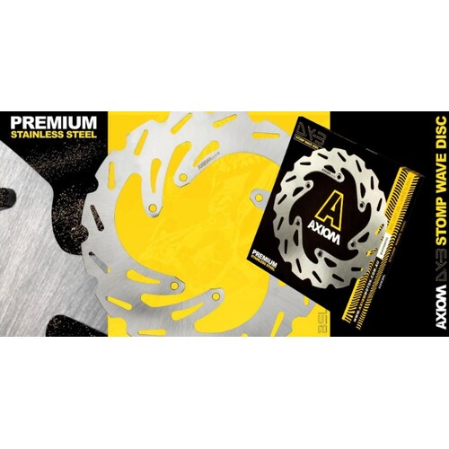 Axiom DX-3 Stomp Wave Discs are premium OEM size brake rotors developed for Motocross and off-road riding. The Stomp Wave rotor is for the rider that wants more than what the stock brake system can provide in extreme conditions.