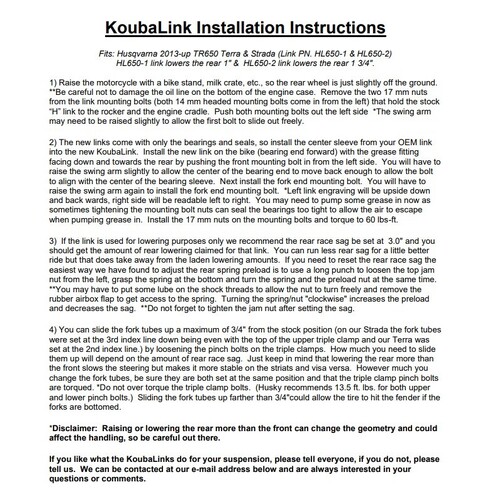 KoubaLink specialises in motorcycle lowering and performance linkages for off-road and dual-sport rear suspension systems. Compromise is not an option at KoubaLink. Listening to riders from all over the world explain where and how they use their off-road and dual-sport bikes. With their input, Koubalink manufacture products that add to your motorcycling experience and make it a little more enjoyable.