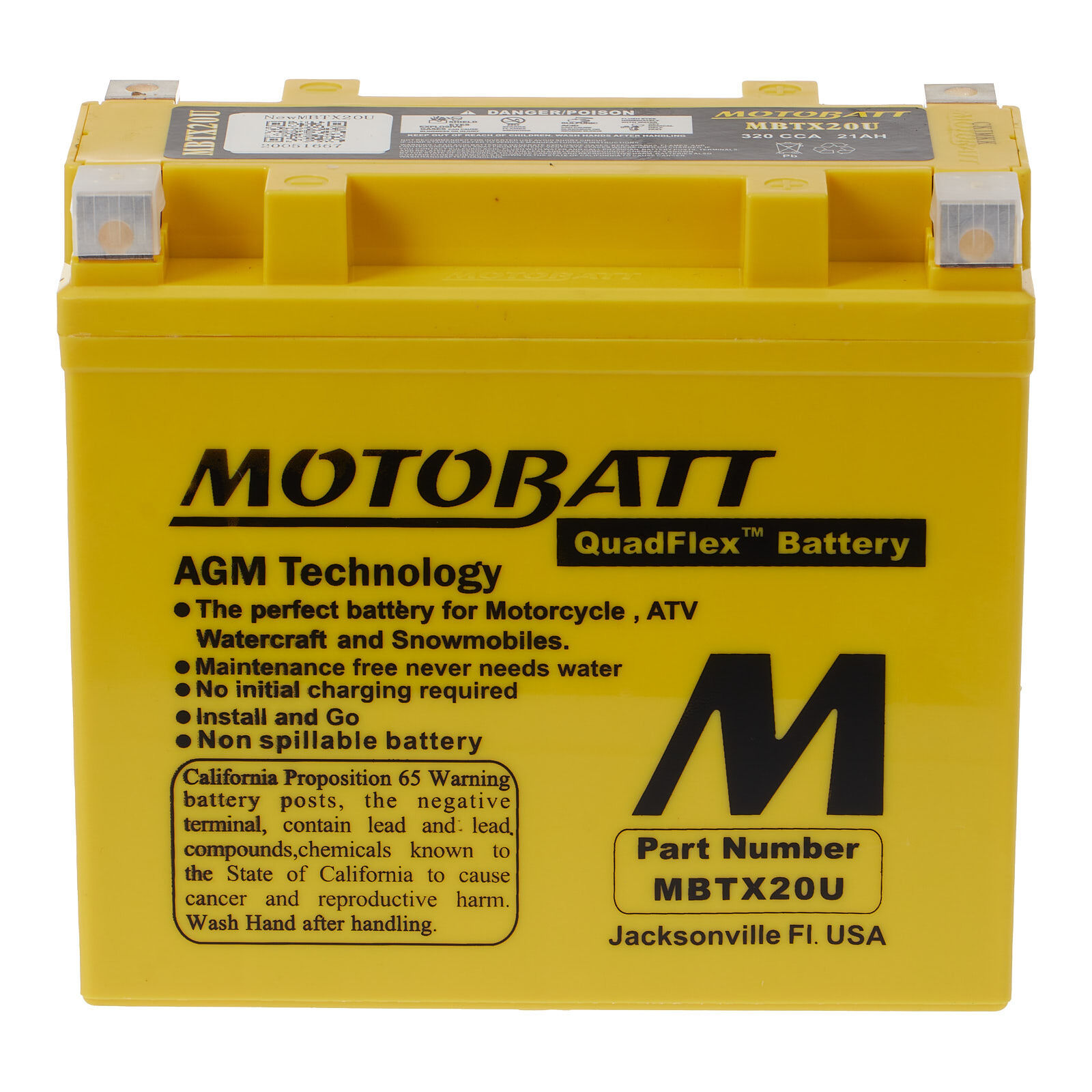 Motobatt batteries are manufactured from Absorbed Glass Mat (AGM) this design has revolutionised the motorcycle ATV lawnmower and small engine industry. QuadFlex provides a unique four-terminal design with two positives two negatives along with height spacers that permit an almost universal fit. All Motobatt AGM Batteries are maintenance-free non-hazardous non-spill charged and ready to install directly out of the box.