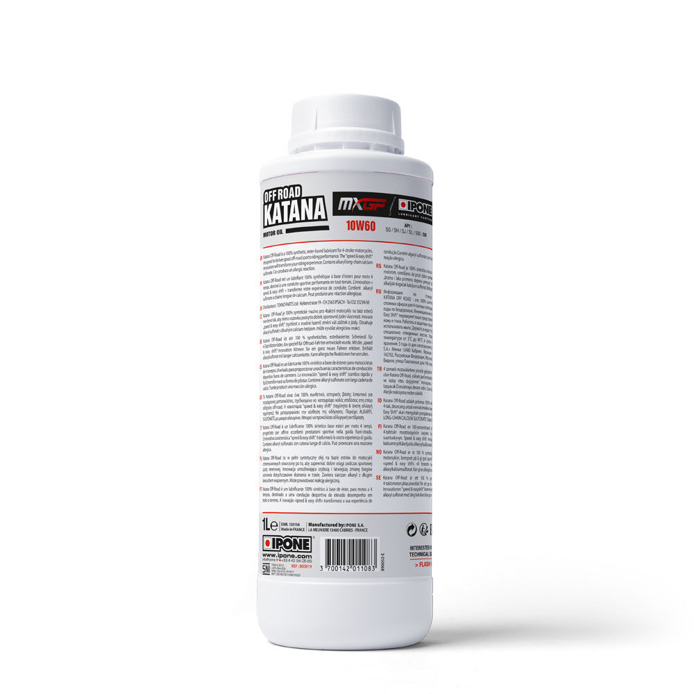 KATANA OFF ROAD is optimized to withstand extreme off-road conditions. Formulated with esters and additives and reinforced with detergents and dispersants to guarantee optimum lubrication at very high temperatures and protect the engine against moisture commonly found on Motocross tracks, Enduro loops and off-road conditions.
