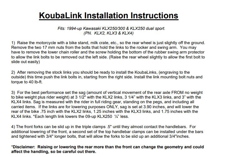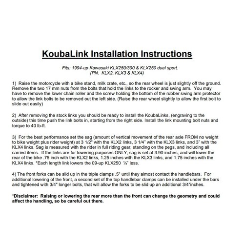 KoubaLink specialises in motorcycle lowering and performance linkages for off-road and dual-sport rear suspension systems. Compromise is not an option at KoubaLink. Listening to riders from all over the world explain where and how they use their off-road and dual-sport bikes. With their input, Koubalink manufacture products that add to your motorcycling experience and make it a little more enjoyable.