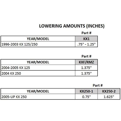 - Lowering amounts indicate REAR lowering, NOT overall bike height.