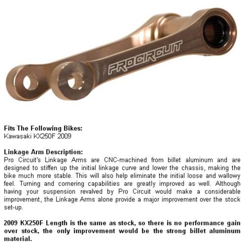 Pro Circuit's Linkage Arms are CNC-machined from billet aluminium and are designed to stiffen up the initial linkage curve and improve the geometry of the chassis, making the bike much more stable. This will also help eliminate the initial loose and wallowy feel. Turning and cornering capabilities are greatly improved as well. Although having your suspension revalved by Pro Circuit would make a considerable improvement, the Linkage Arms alone provide a major improvement over the stock set-up. Each link arm includes all of the required bearings and seals.Fitment Details