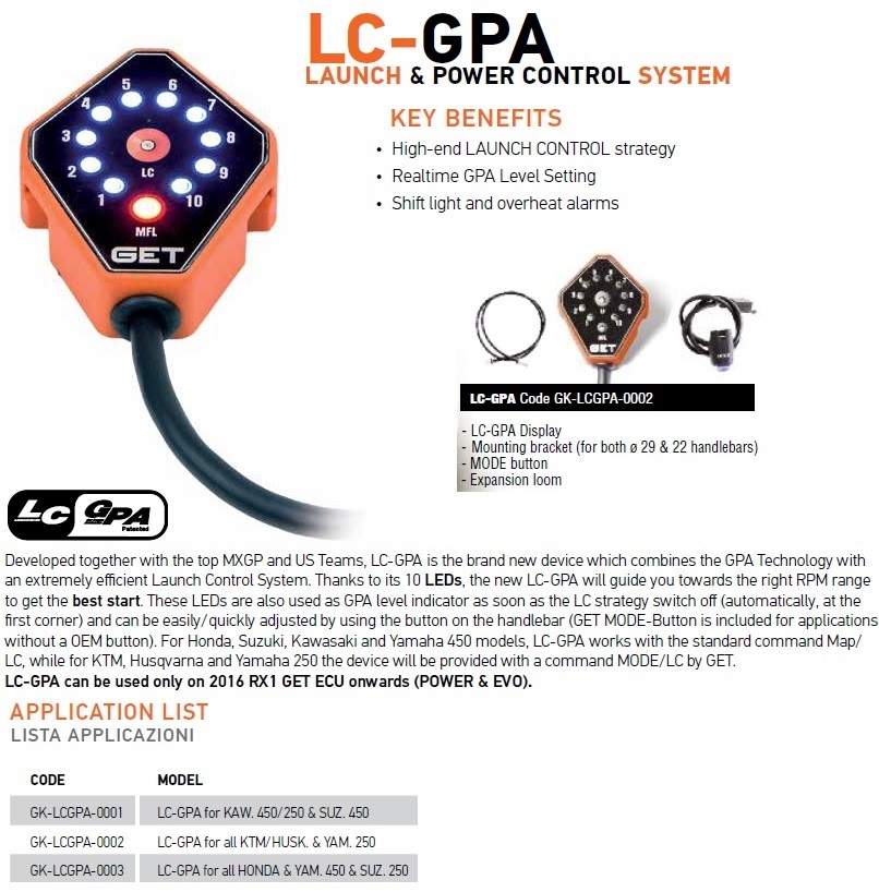 - For 2016 KTM (250, 350 & 450) you just have to plug the LCGPA to the GET RX1 and the MODE-LC button to the LC-GPA (provided on this kit) and you’ll be able to manage its functions by using the MODE-LC button.