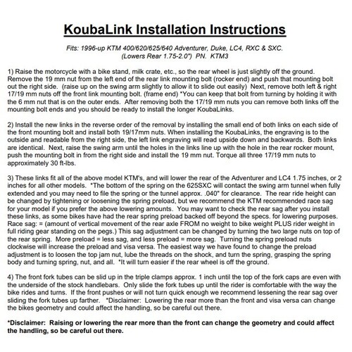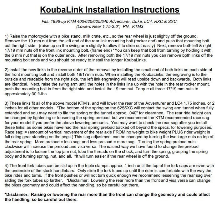 KoubaLink specialises in motorcycle lowering and performance linkages for off-road and dual-sport rear suspension systems. Compromise is not an option at KoubaLink. Listening to riders from all over the world explain where and how they use their off-road and dual-sport bikes. With their input, Koubalink manufacture products that add to your motorcycling experience and make it a little more enjoyable.