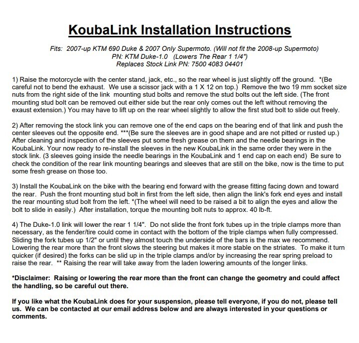 KoubaLink specialises in motorcycle lowering and performance linkages for off-road and dual-sport rear suspension systems. Compromise is not an option at KoubaLink. Listening to riders from all over the world explain where and how they use their off-road and dual-sport bikes. With their input, Koubalink manufacture products that add to your motorcycling experience and make it a little more enjoyable.